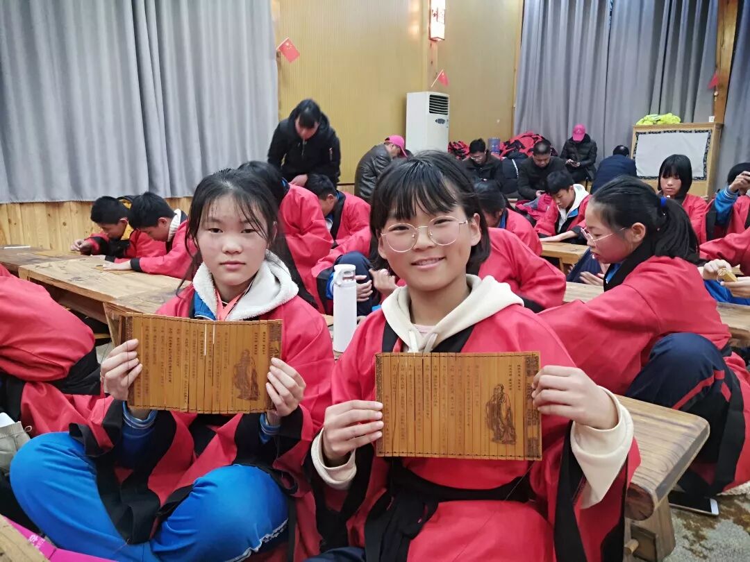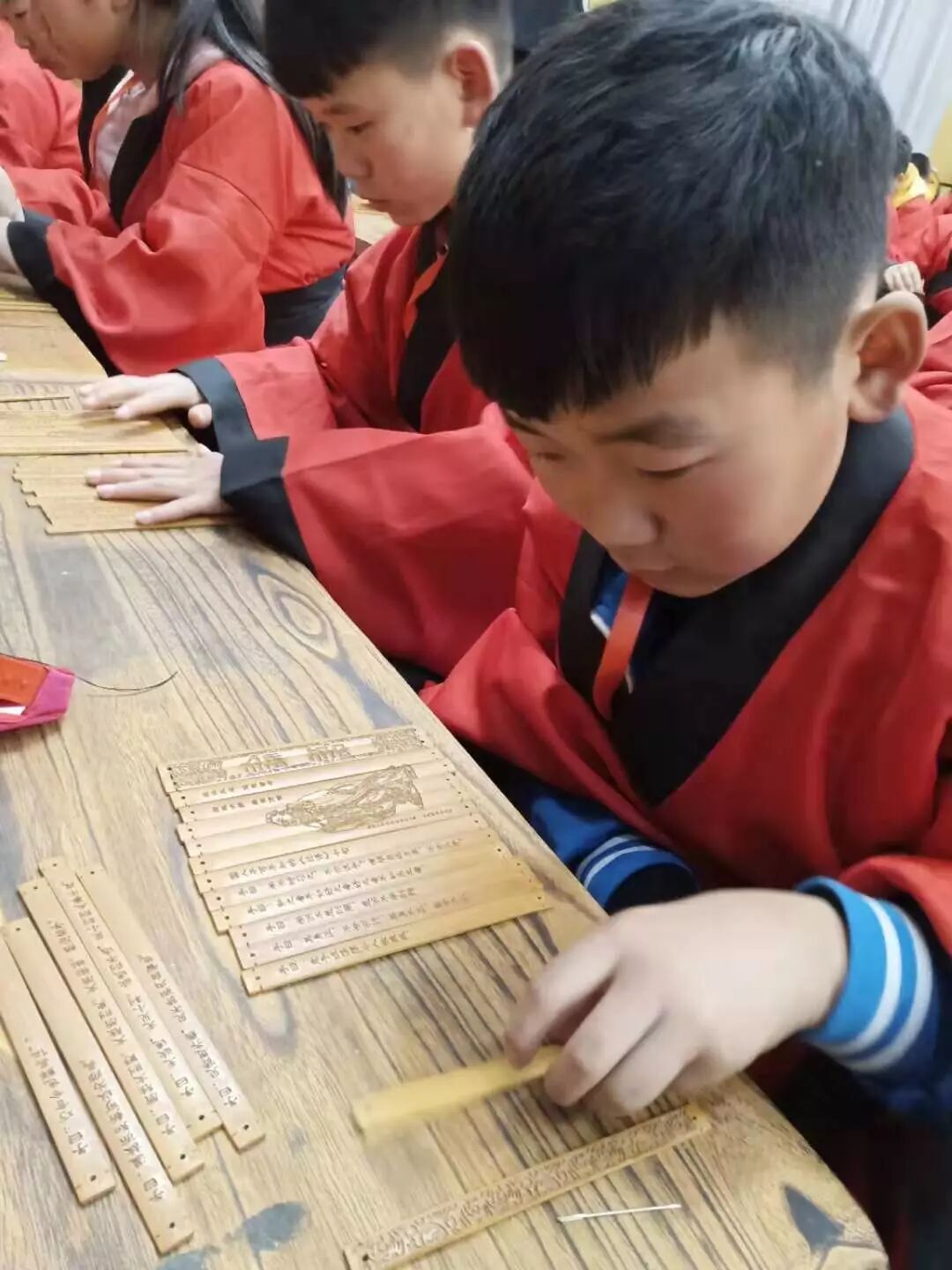 之后,同学们了解了孔子“韦编三绝”的历史故事,并在研学导师的指导下,亲自动手制作了一卷属于自己的竹简。在这个过程中,体会圣人的勤奋,并了解了我国古代书籍的演变过程。