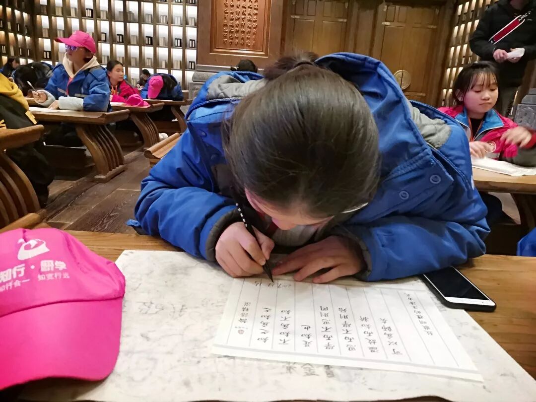 参观了以仁义礼智信命名的五厅后,感悟圣贤智慧与建筑的融合。在仁厅观看“天下归仁”灯光秀,并在书案前体验“手读论语”,在经过了两天的研学活动后,能静默案前,抄写下早已熟悉的论语篇章,相信大家都会有另一番感悟吧。